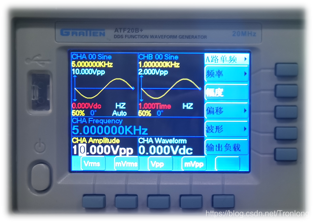 将TL8568P模块的任意通道正确连接信号发生器,并使信号发生器输出10Vpp、5KHz的正弦波。本案例支持8通道AD数据同时采集与显示,本次测试仅演示ADC_V1通道AD数据的采集与显示。