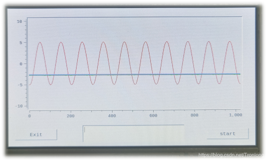 按照用户手册操作步骤进行程序的加载,Qt程序运行后,LCD显示屏将显示AD数据的正弦波。点击屏幕上的pause按钮后,波形将暂停在某个状态,再点击start按钮,显示屏又将显示动态波形,点击Exit按钮可退出显示。