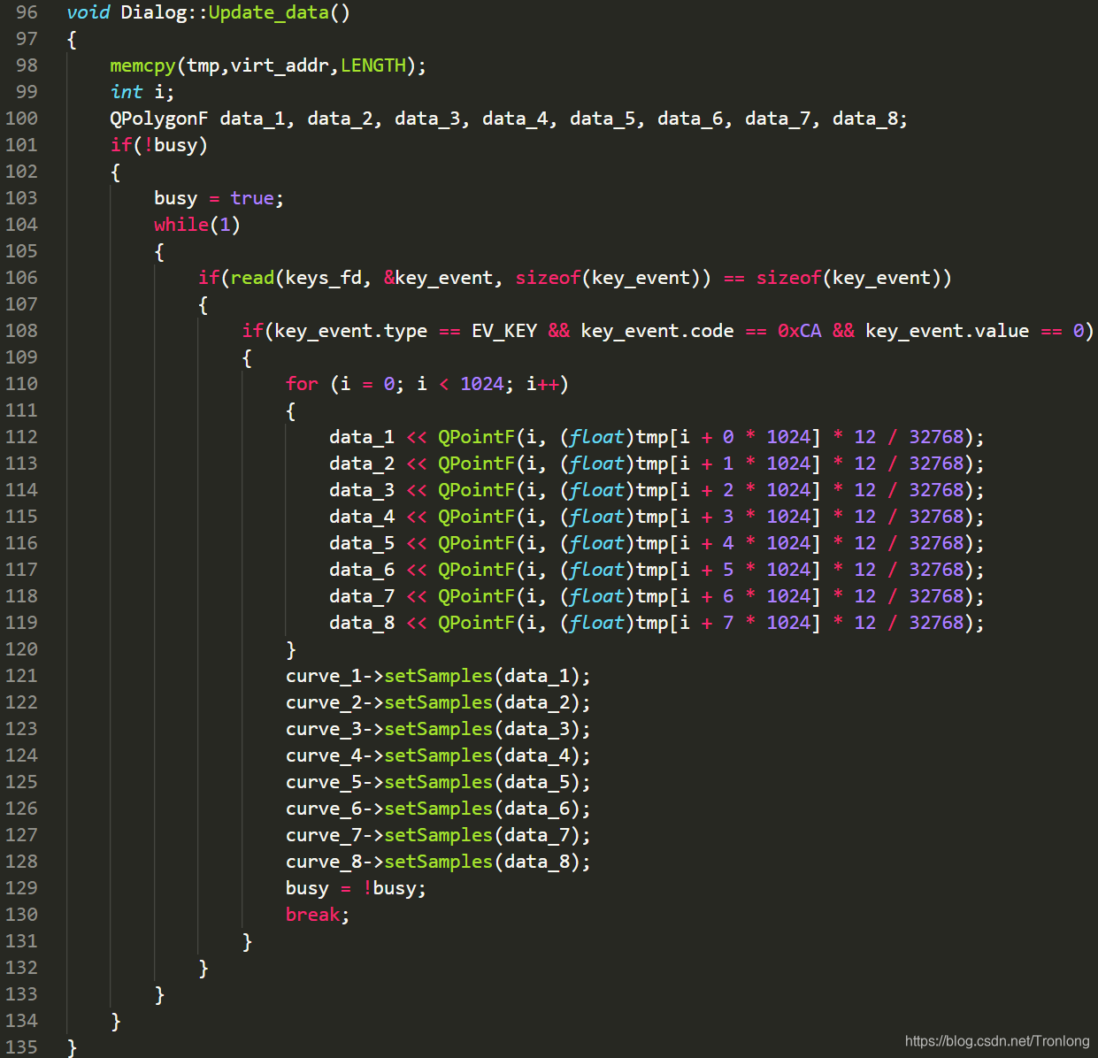 Spartan-6 FPGA通过ADS8568进行AD数据采集,并将AD数据通过核心板内部与ARM端连接的GPMC高速并行接口传送到AM437x ARM。ARM端运行Qt程序,将从GPMC接口读取的AD数据进行波形显示。